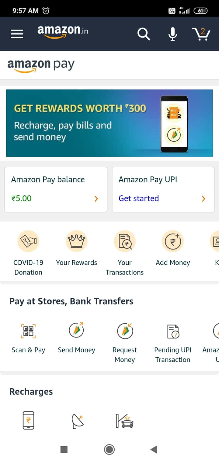 Amazon Pay भी Google pay, Phone pe आदि की तरह ऑनलाइन पेमेंट कि सुविधा देता है. इसमे भी आप अपने बैंक अकाउंट को लिंक करके online transaction (लेनदेन) कर सकते है. Amazon pay से आप कई तरह के बिल,मोबाइल रिचार्ज, DTH रिचार्ज आदि कर सकते है.इसमे bank account लिंक करने की प्रक्रिया Google pay या Phone pe जैसी ही है.