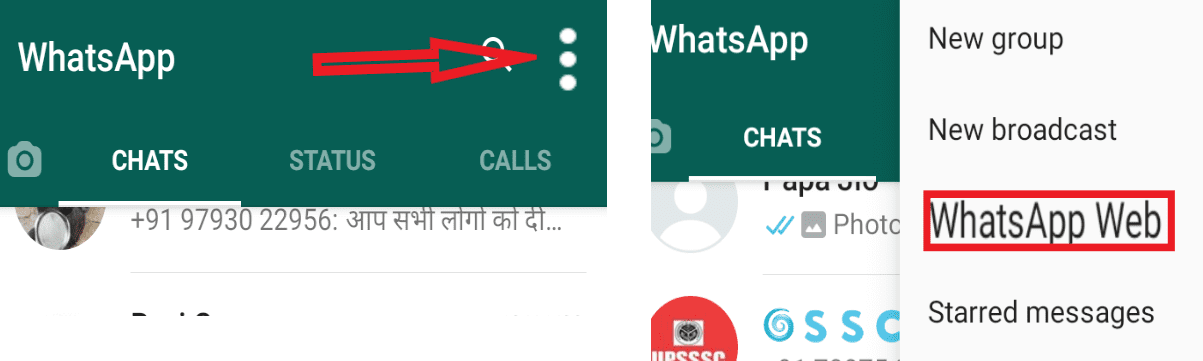 • Step 2: अपने मोबाइल में WhatsApp ओपन करे इसमे दायी तरफ कोने में 3 डॉट पर क्लिक करे यहा पर आपको Whatsapp web दिखाई देगा.